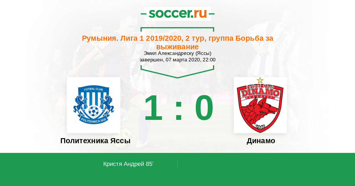 85' (1:0) Кристя Андрей (10) (Шербан Сорин (17))