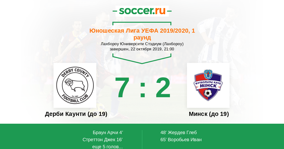 Протокол матча Дерби Каунти (до 19) против Минск (до 19)