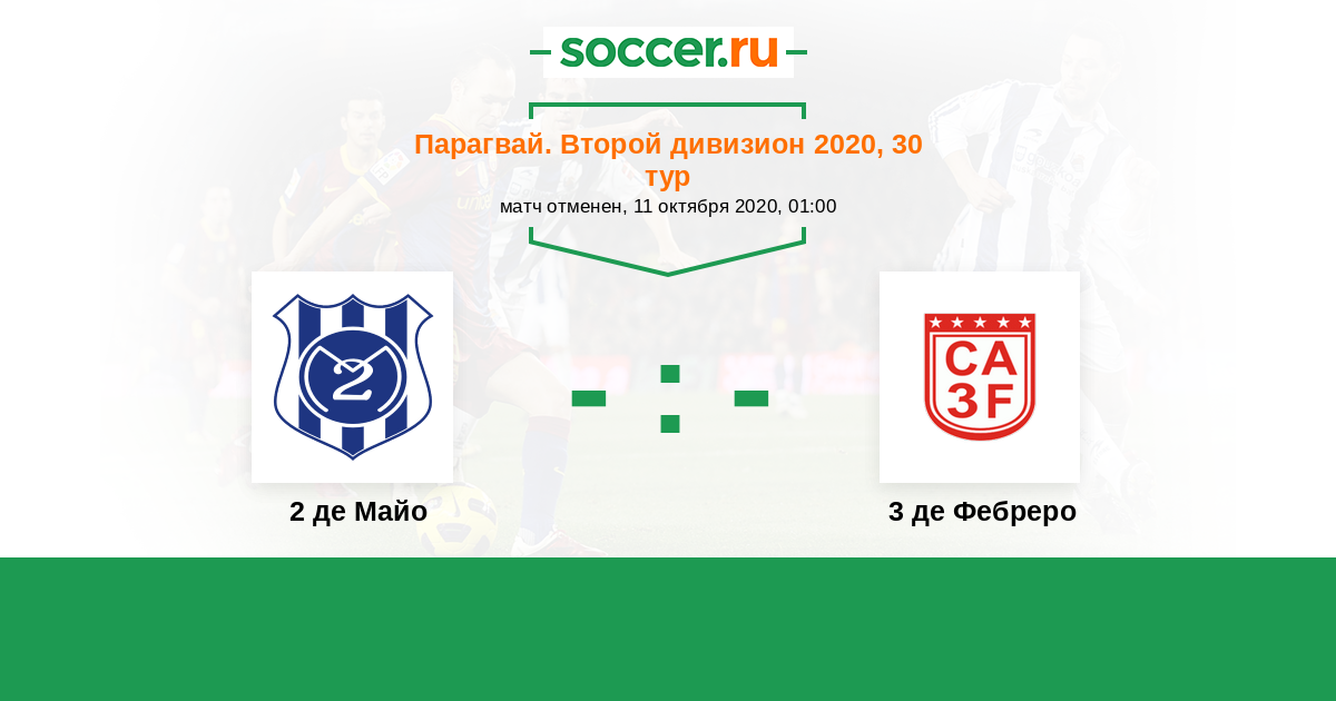 Парагвай. Второй дивизион 15.05.2021 2 де Майо Логотип футбольный клуб 2 де Майо (Педро-Хуан-Кабальеро) 3:4 Логотип футбольный клуб 3 де Фебреро (Сьюдад-дель-Эсте) 3 де Фебреро