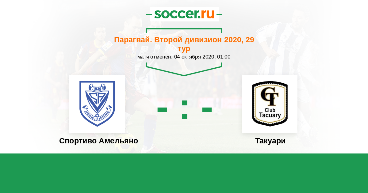 Парагвай. Второй дивизион 03.05.2021 Такуари Логотип футбольный клуб Такуари (Асунсьон) 1:2 Логотип футбольный клуб Спортиво Амельяно (Асунсьон) Спортиво Амельяно