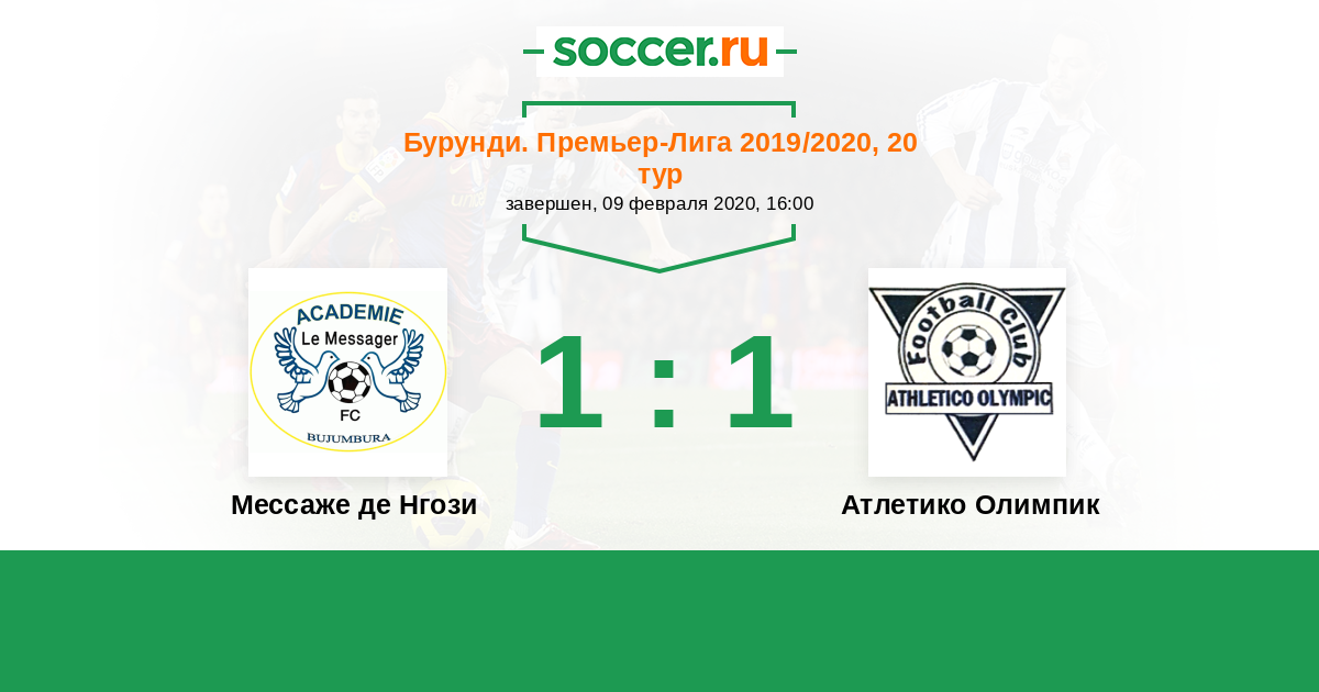 Бурунди. Премьер-лига 09.02.2020 Мессаже де Нгози Логотип футбольный клуб Мессаже де Нгози 1:1 Логотип футбольный клуб Атлетико Олимпик Атлетико Олимпик