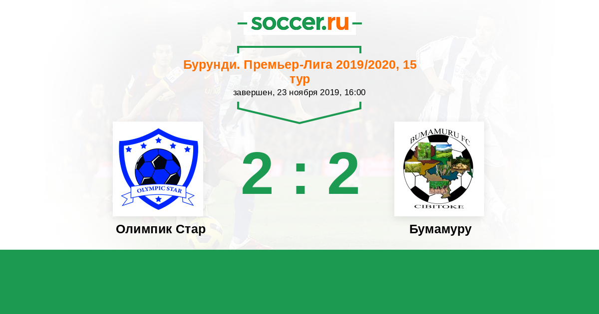 Бурунди. Премьер-лига 24.06.2020 Олимпик Стар Логотип футбольный клуб Олимпик Стар (Муйинга) 2:3 Логотип футбольный клуб Мессаже де Нгози Мессаже де Нгози