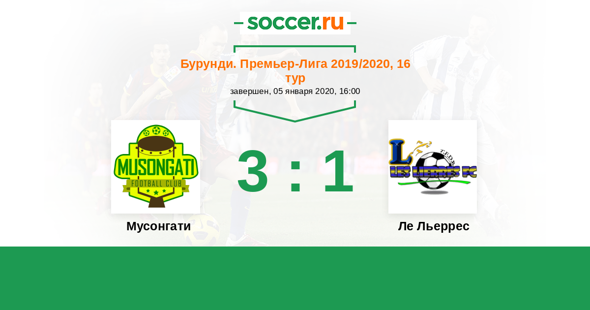 Бурунди. Премьер-лига 06.10.2019 Ле Льеррес Логотип футбольный клуб Ле Льеррес (Бужумбура) 1:2 Логотип футбольный клуб Мусонгати (Гитега) Мусонгати