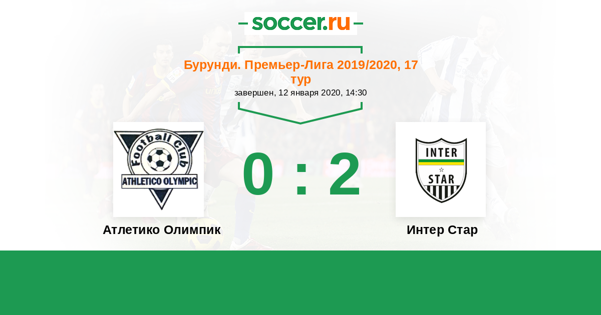 Бурунди. Премьер-лига 25.09.2019 Интер Стар Логотип футбольный клуб Интер Стар (Бужумбура) 1:1 Логотип футбольный клуб Атлетико Олимпик Атлетико Олимпик