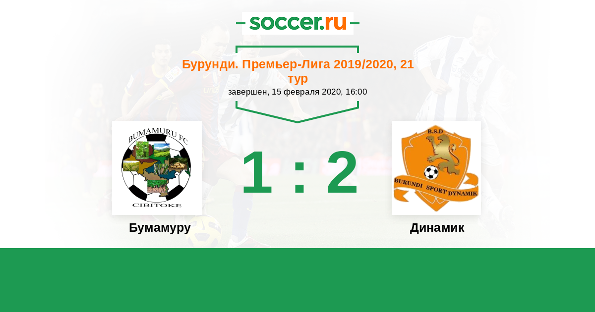 Бурунди. Премьер-лига 15.02.2020 Бумамуру Логотип футбольный клуб Бумамуру (Буганда) 1:2 Логотип футбольный клуб Динамик (Бужумбура) Динамик