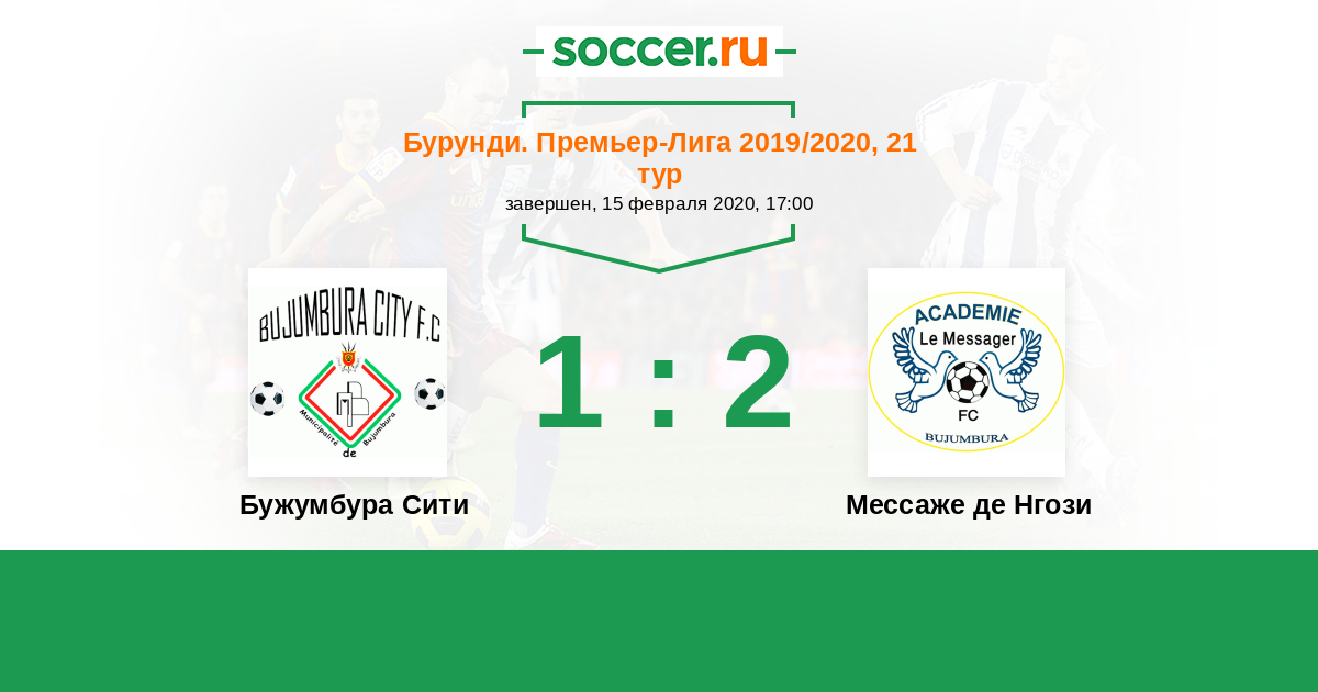 Бурунди. Премьер-лига 15.02.2020 Бужумбура Сити Логотип футбольный клуб Бужумбура Сити 1:2 Логотип футбольный клуб Мессаже де Нгози Мессаже де Нгози