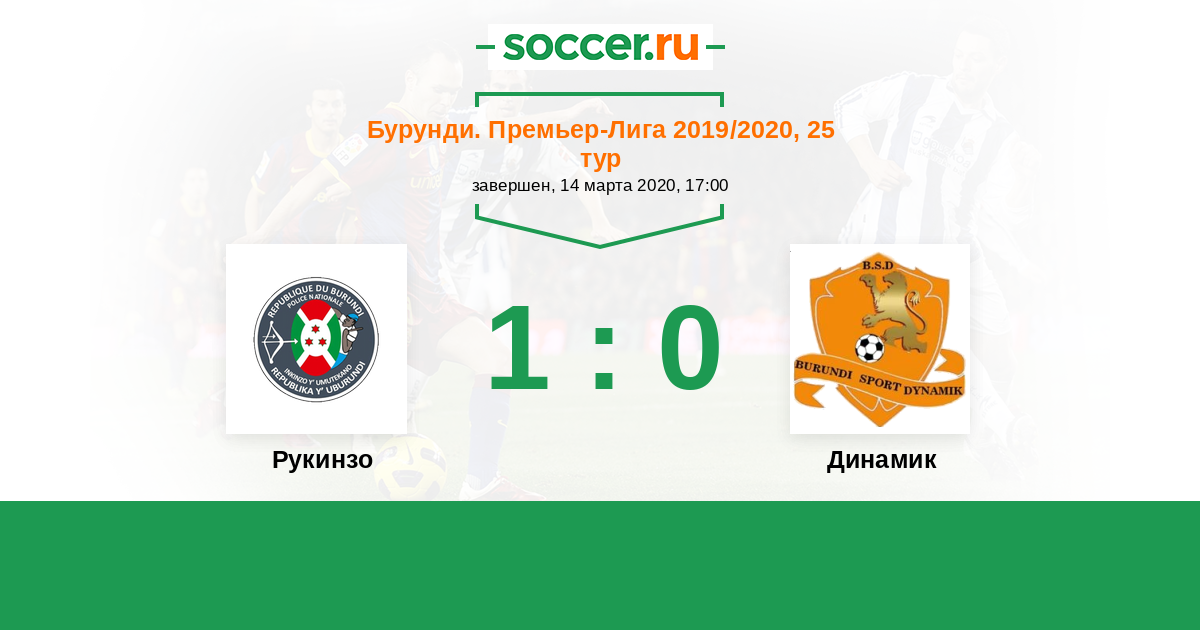 Бурунди. Премьер-лига 14.03.2020 Рукинзо Логотип футбольный клуб Рукинзо (Бужумбура) 1:0 Логотип футбольный клуб Динамик (Бужумбура) Динамик