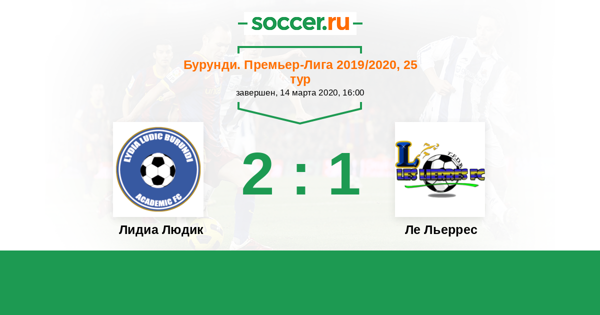 Бурунди. Премьер-лига 18.08.2019 Ле Льеррес Логотип футбольный клуб Ле Льеррес (Бужумбура) 1:2 Логотип футбольный клуб Лидиа Людик (Макамба) Лидиа Людик