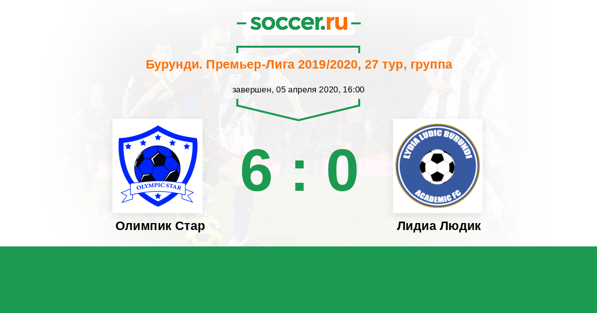 Бурунди. Премьер-лига 26.09.2019 Лидиа Людик Логотип футбольный клуб Лидиа Людик (Макамба) 2:0 Логотип футбольный клуб Олимпик Стар (Муйинга) Олимпик Стар
