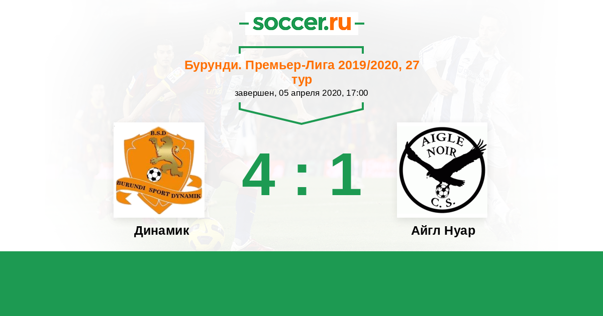 Бурунди. Премьер-лига 05.04.2020 Динамик Логотип футбольный клуб Динамик (Бужумбура) 4:1 Логотип футбольный клуб Айгл Нуар (Макамба) Айгл Нуар