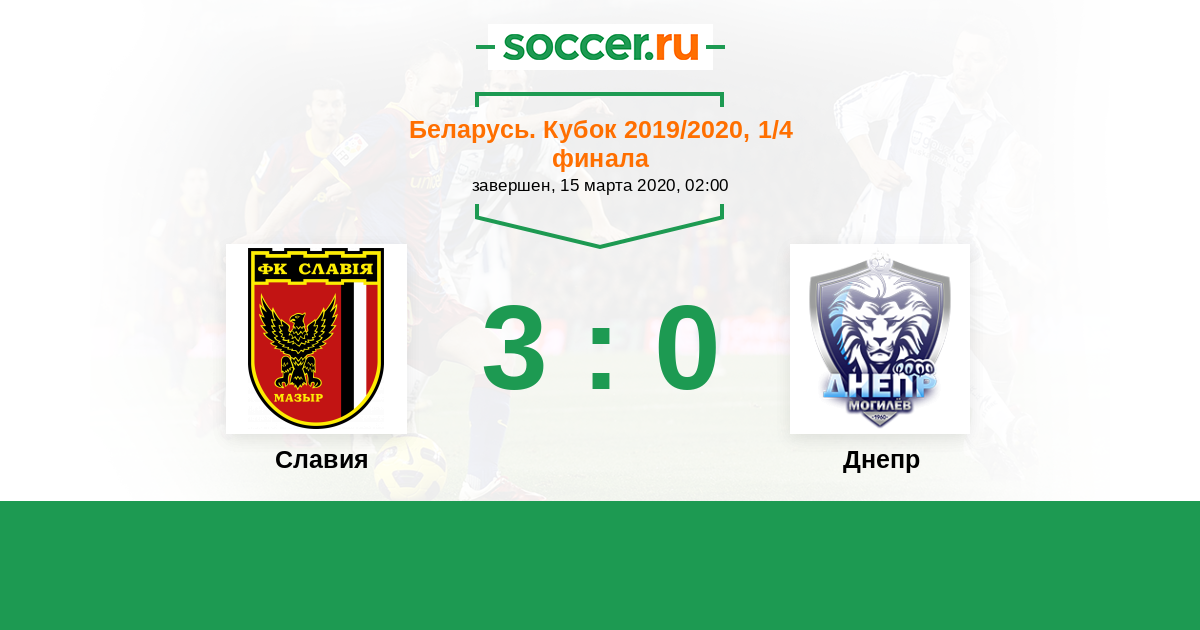 Беларусь. Кубок 09.03.2020 Днепр Логотип футбольный клуб Днепр (Могилев) 0:3 Логотип футбольный клуб Славия (Мозырь) Славия