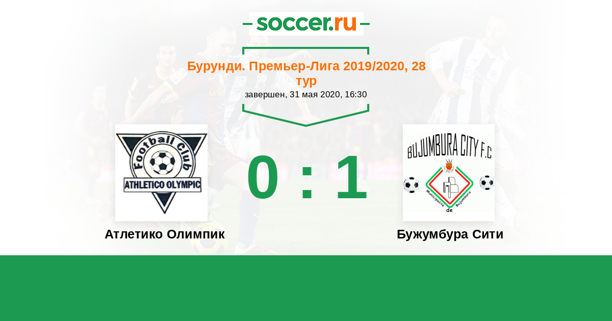 Бурунди. Премьер-лига 31.05.2020 Атлетико Олимпик Логотип футбольный клуб Атлетико Олимпик 0:1 Логотип футбольный клуб Бужумбура Сити Бужумбура Сити
