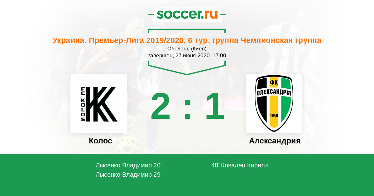 Протокол матча Колос против Александрия