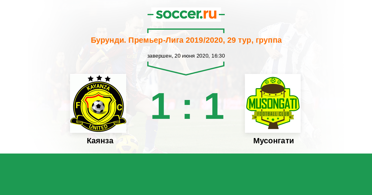 Бурунди. Премьер-лига 20.06.2020 Каянза Логотип футбольный клуб Каянза (Муйинга) 1:1 Логотип футбольный клуб Мусонгати (Гитега) Мусонгати