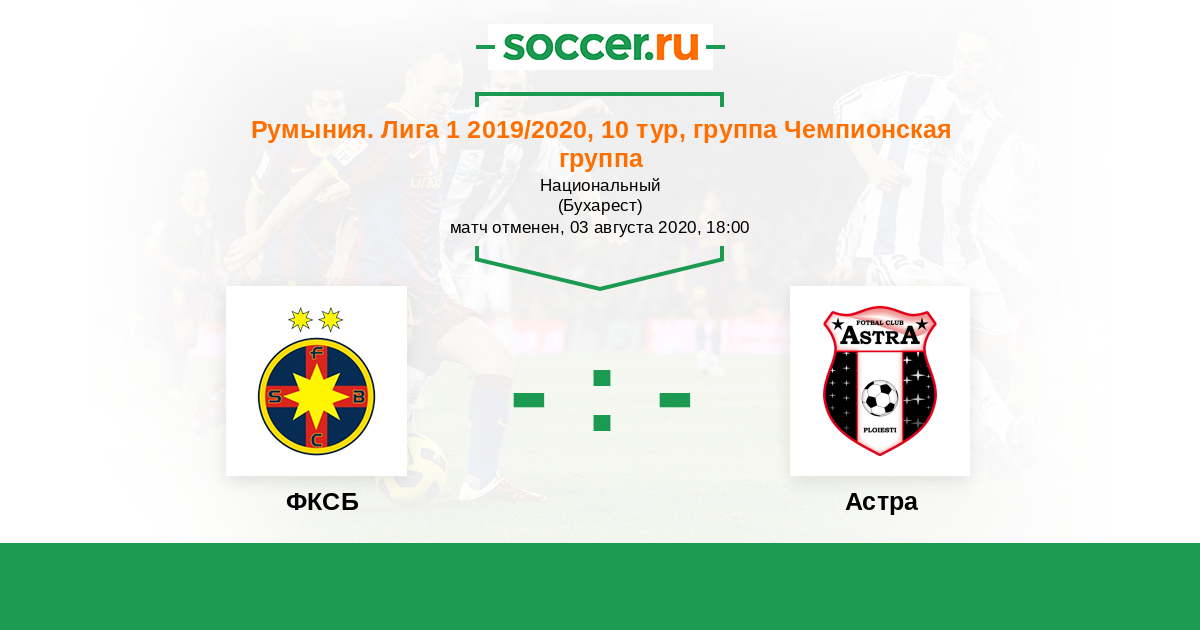 Румыния. Лига 1 22.08.2020 Астра Логотип футбольный клуб Астра (Джурджу) 0:3 Логотип футбольный клуб ФКСБ (Бухарест) ФКСБ
