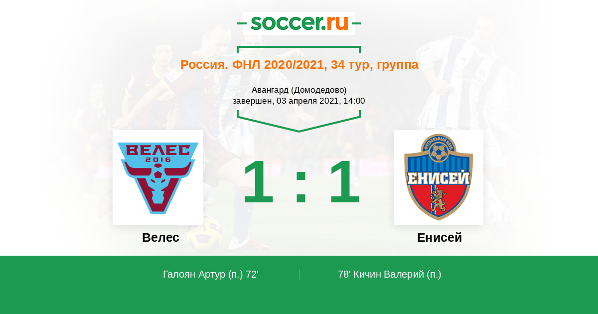 Протокол матча Велес против Енисей