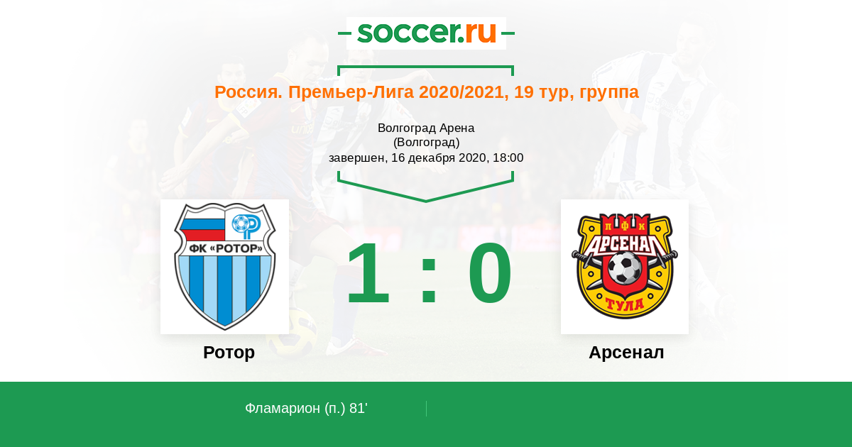 С победой!!!! Вязкая игра с обилием борьбы в центре поля. Вторая победа к ряду - это радует!!! Успехов родной команде!!!! Арсенал грязновато играл.... Владел мячом, но ничего опасного не создал. Даня Степанов по праву стал лучшим игроком. Гогуа тоже красавчик. Больше у Ротора выделить некого. Главное это победа в отсутствии двух ключевых игроков полузащиты. Это ощущалось и тревожило