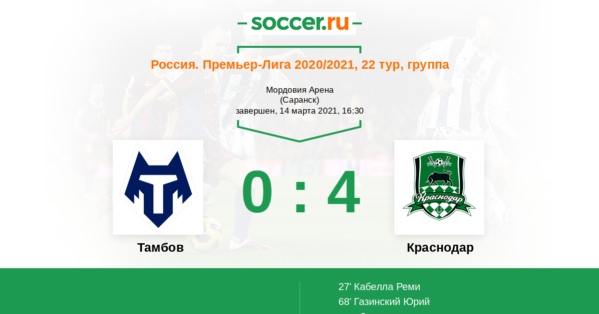 Протокол матча Тамбов против Краснодар