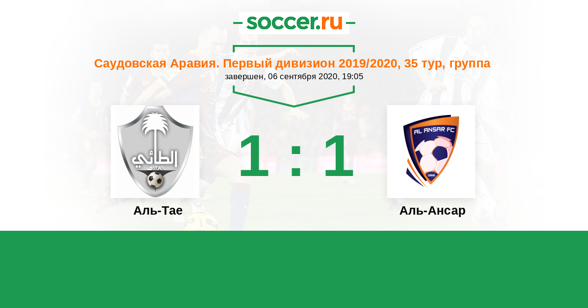 Саудовская Аравия. Первый дивизион 11.12.2019 Аль-Ансар Логотип футбольный клуб Аль-Ансар (Медина) 1:1 Логотип футбольный клуб Аль-Тае (Хаиль) Аль-Тае