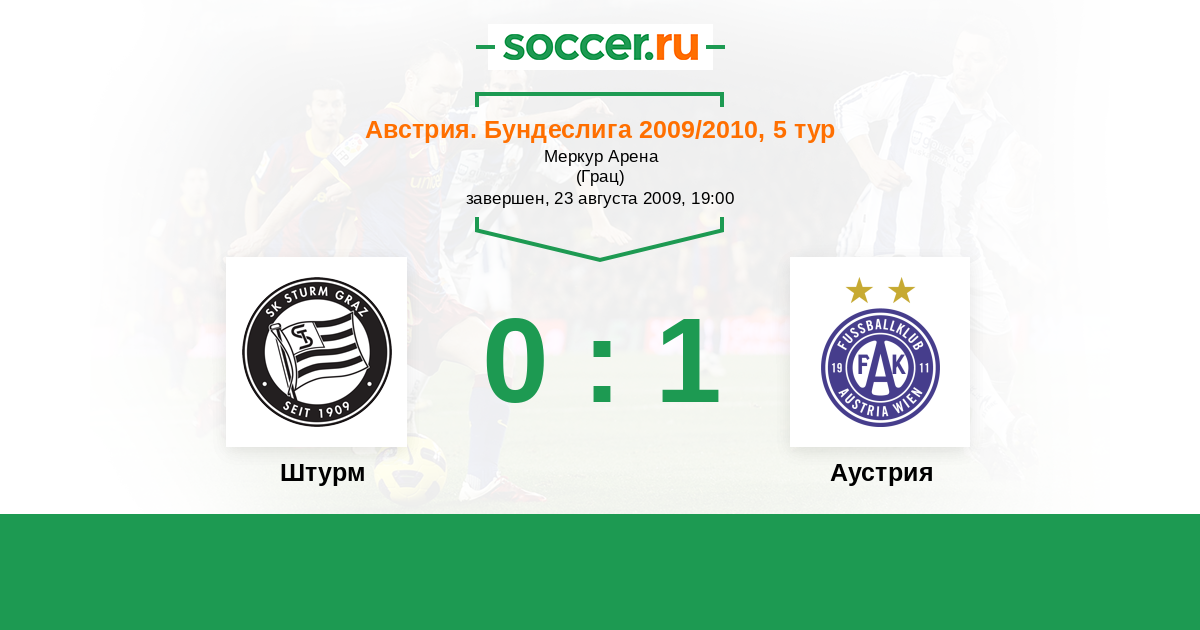 Австрия. Бундеслига 26.09.2010 Штурм Логотип футбольный клуб Штурм (Грац) 0:2 Логотип футбольный клуб Аустрия (Вена) Аустрия
