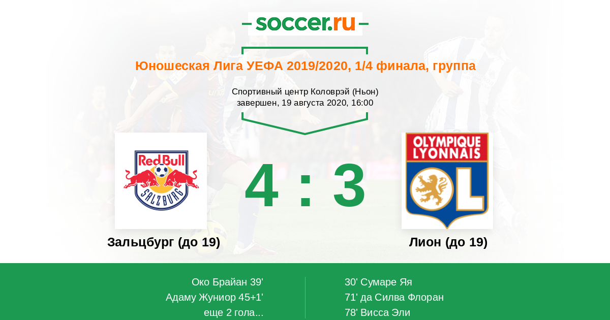 Протокол матча Зальцбург (до 19) против Лион (до 19)