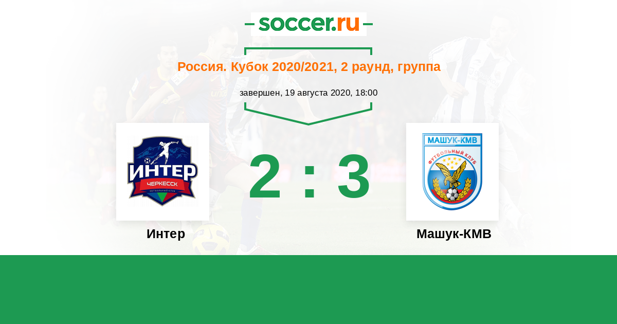 Россия. Вторая лига. Группа 1 23.08.2020 Машук-КМВ Логотип футбольный клуб Машук-КМВ (Пятигорск) 3:1 Логотип футбольный клуб Интер (Черкесск) Интер