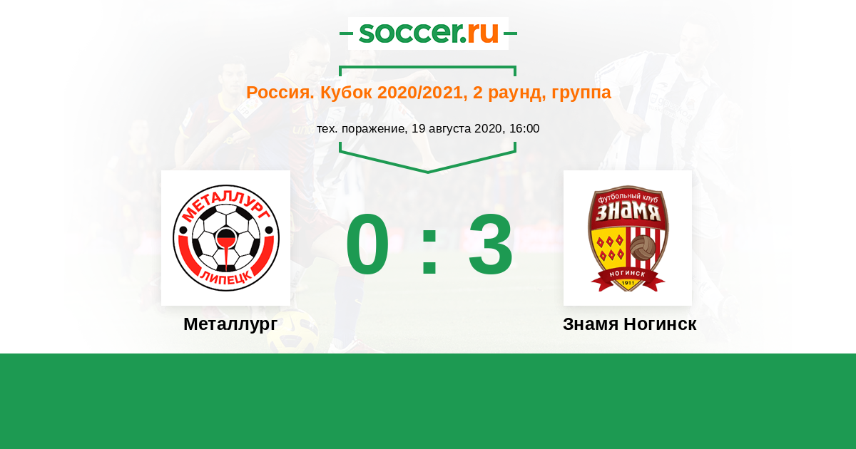 Россия. Вторая лига. Группа 3 15.08.2020 Знамя Ногинск Логотип футбольный клуб Знамя Ногинск 3:0 Логотип футбольный клуб Металлург (Липецк) Металлург