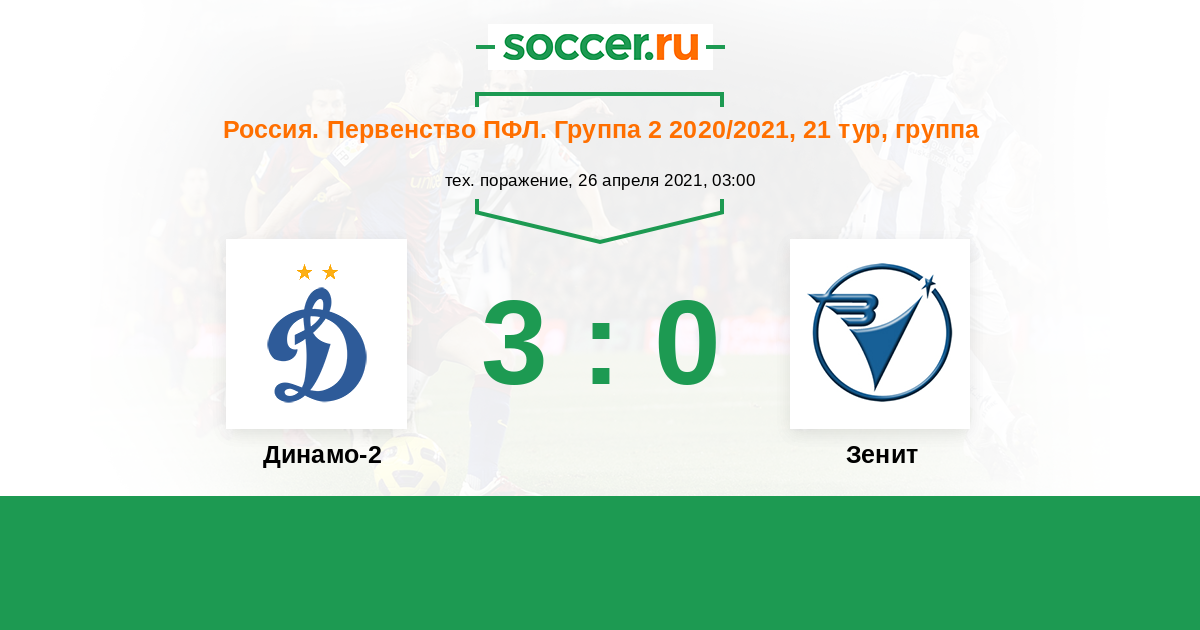 Россия. Вторая лига. Группа 2 26.04.2021 Динамо-2 Логотип футбольный клуб Динамо-2 (Москва) 3:0 Логотип футбольный клуб Зенит (Иркутск) Зенит