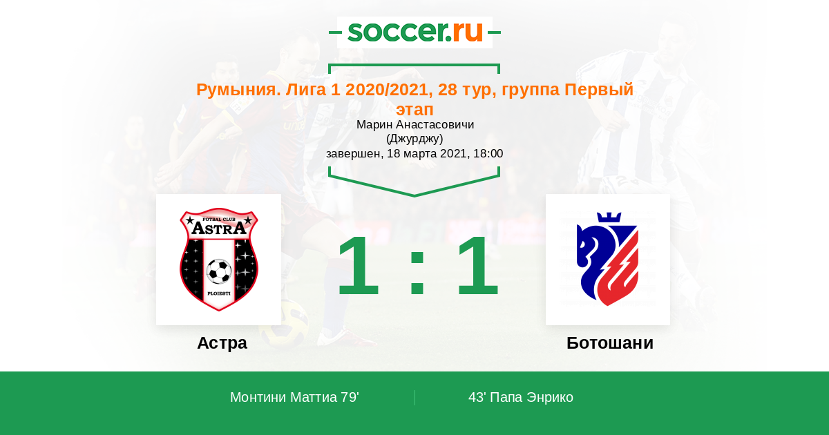 79' (1:1) Монтини Маттиа (43) (Георге Валентин (11))
