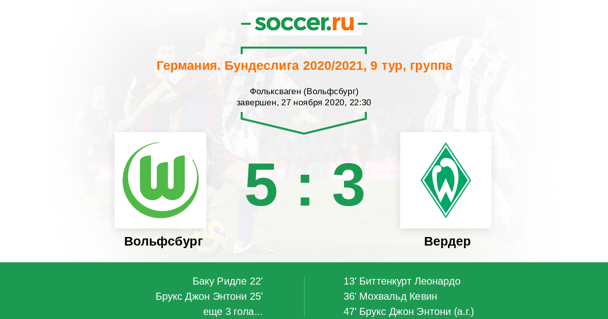 Протокол матча Вольфсбург против Вердер
