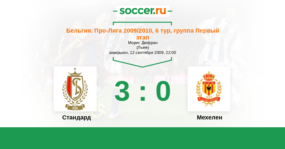 Бельгия. Про-Лига 17.09.2010 Мехелен Логотип футбольный клуб Мехелен 1:0 Логотип футбольный клуб Стандард (Льеж) Стандард