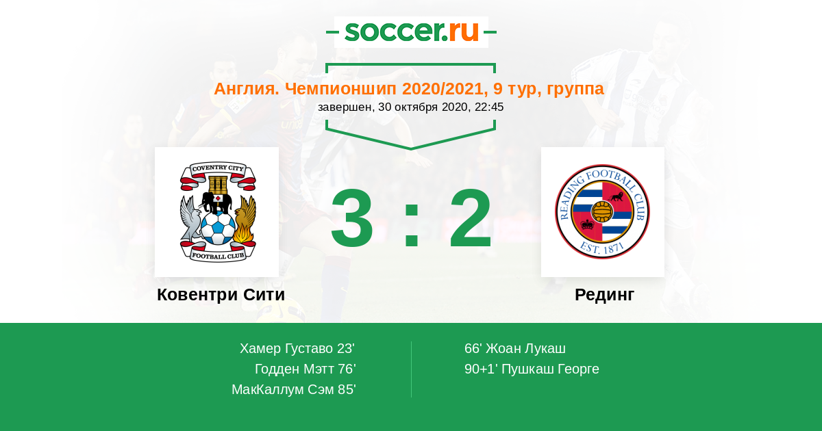 Протокол матча Ковентри Сити против Рединг
