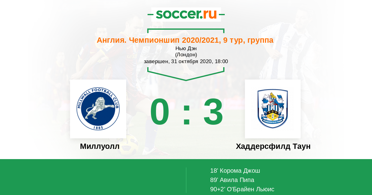 Протокол матча Миллуолл против Хаддерсфилд Таун