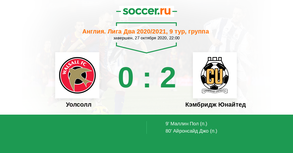 Протокол матча Уолсолл против Кэмбридж Юнайтед
