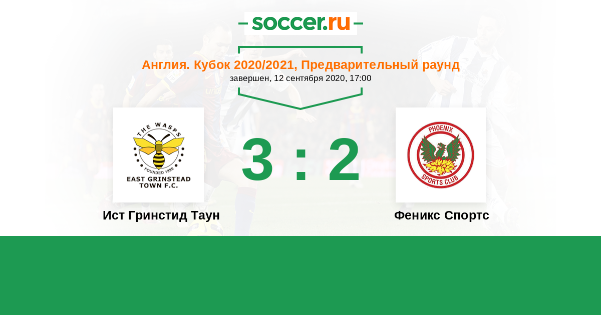 Англия. Первый дивизион истмийской лиги: Север 17.09.2019 Феникс Спортс Логотип футбольный клуб Феникс Спортс (Барнехерст) 6:3 Логотип футбольный клуб Ист Гринстид Таун Ист Гринстид Таун