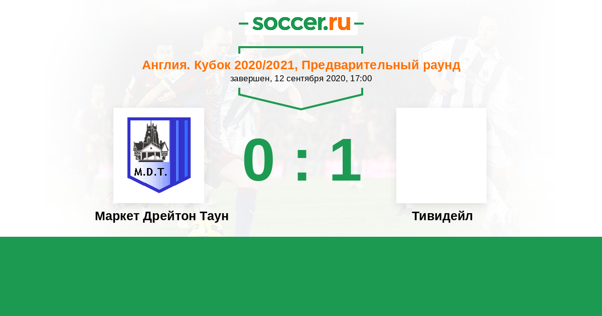 Англия. Кубок 12.09.2020 Маркет Дрейтон Таун Логотип футбольный клуб Маркет Дрейтон Таун 0:1 Логотип футбольный клуб Тивидейл Тивидейл