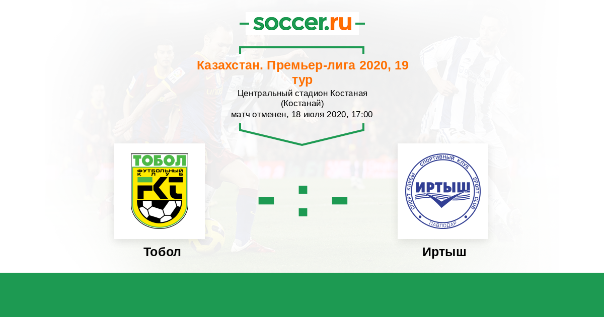 Казахстан. Премьер-лига 17.08.2019 Иртыш Логотип футбольный клуб Иртыш (Павлодар) 0:0 Логотип футбольный клуб Тобол (Костанай) Тобол