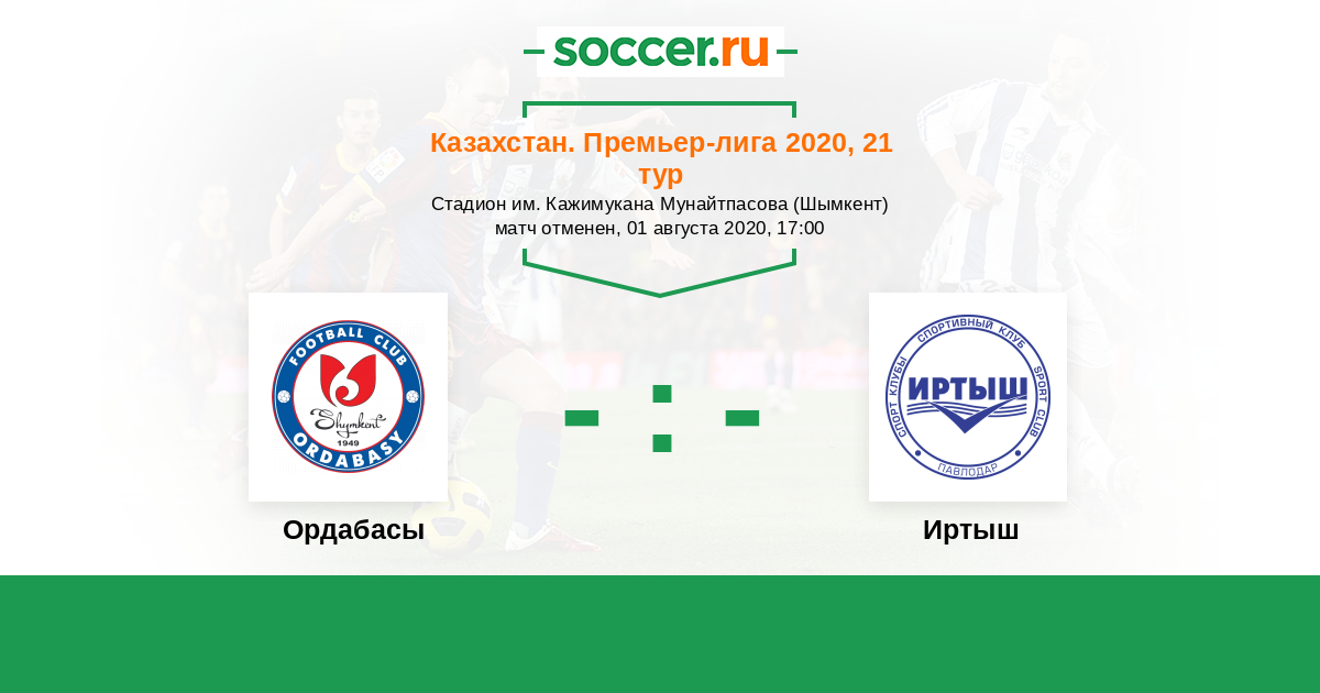 Казахстан. Премьер-лига 28.07.2019 Ордабасы Логотип футбольный клуб Ордабасы (Шымкент) 1:0 Логотип футбольный клуб Иртыш (Павлодар) Иртыш