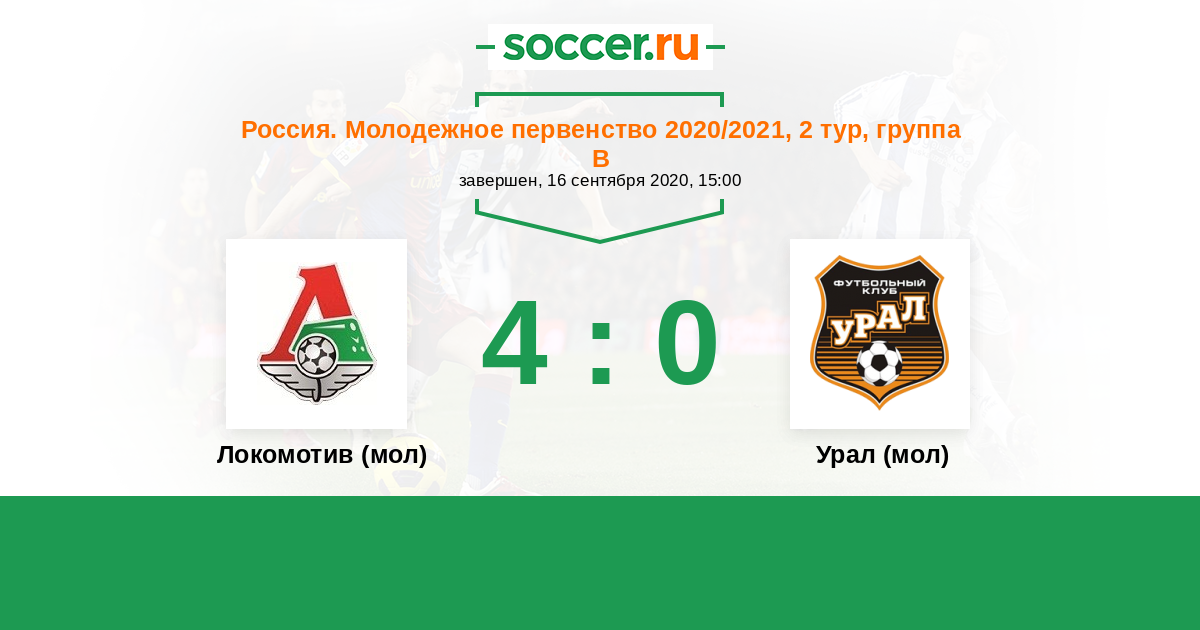 Россия. Премьер-Лига U21 10.08.2019 Локомотив (мол) Логотип футбольный клуб Локомотив (мол) (Москва) 2:0 Логотип футбольный клуб Урал (мол) (Екатеринбург) Урал (мол)