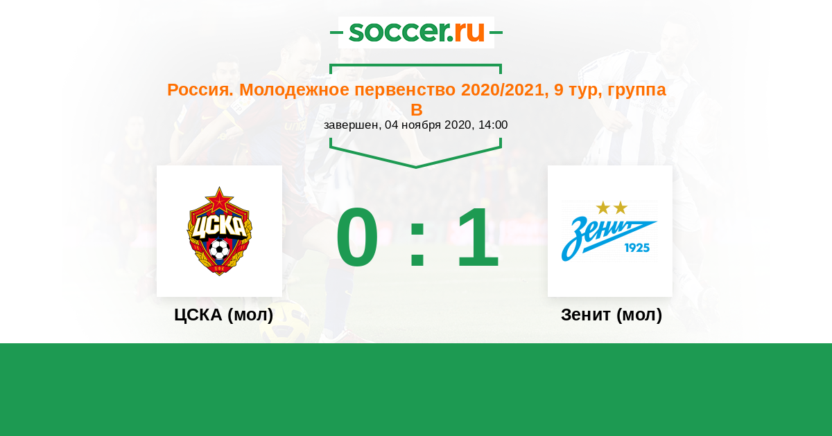 Россия. Премьер-Лига U21 31.10.2014 ЦСКА (мол) Логотип футбольный клуб ЦСКА (мол) (Москва) 1:0 Логотип футбольный клуб Зенит (мол) (Санкт-Петербург) Зенит (мол)
