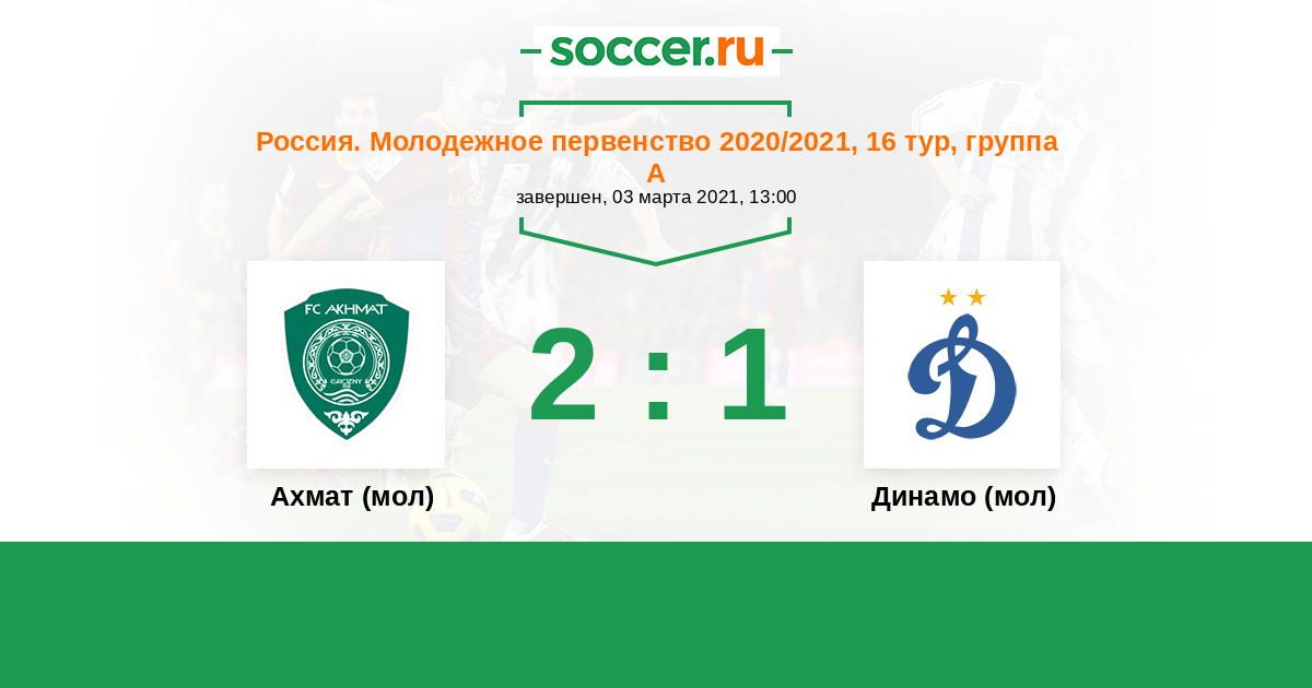 Россия. Премьер-Лига U21 13.03.2020 Ахмат (мол) Логотип футбольный клуб Ахмат (мол) (Грозный) 2:1 Логотип футбольный клуб Динамо (мол) (Москва) Динамо (мол)
