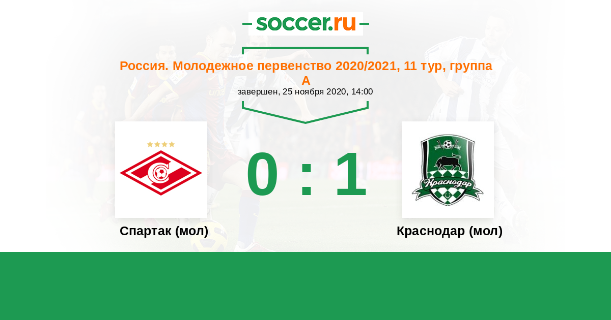 Россия. Премьер-Лига U21 29.09.2020 Краснодар (мол) Логотип футбольный клуб Краснодар (мол) 1:1 Логотип футбольный клуб Спартак (мол) (Москва) Спартак (мол)