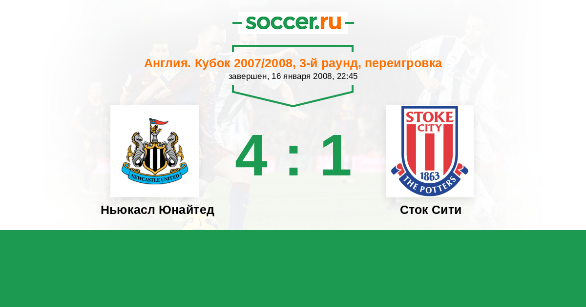 Англия. Кубок 06.01.2008 Сток Сити Логотип футбольный клуб Сток Сити (Сток-он-Трент) 0:0 Логотип футбольный клуб Ньюкасл Юнайтед (Ньюкасл-апон-Тайн) Ньюкасл Юнайтед