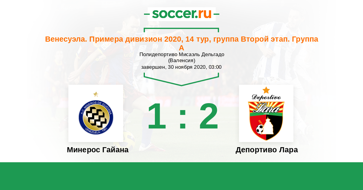 Венесуэла. Примера дивизион 28.10.2020 Депортиво Лара Логотип Депортиво Лара (Баркисимето) 1:1 Логотип футбольный клуб Минерос Гайана Минерос Гайана