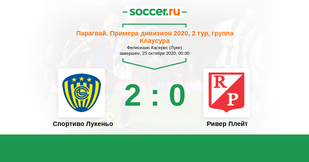Парагвай. Примера дивизион 31.07.2020 Спортиво Лукеньо Логотип футбольный клуб Спортиво Лукеньо 0:1 Логотип футбольный клуб Ривер Плейт (Асунсьон) Ривер Плейт