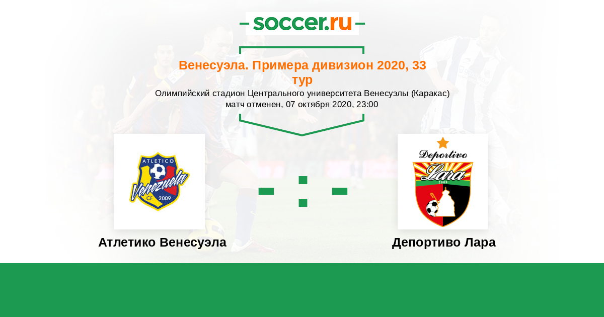 Венесуэла. Примера дивизион 19.10.2020 Атлетико Венесуэла Логотип Атлетико Венесуэла (Майкуетья) 0:3 Логотип Депортиво Лара (Баркисимето) Депортиво Лара