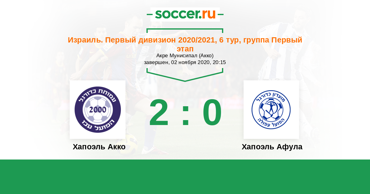 Израиль. Первый дивизион 18.02.2020 Хапоэль Акко Логотип футбольный клуб Хапоэль Акко 0:1 Логотип футбольный клуб Хапоэль Афула Хапоэль Афула