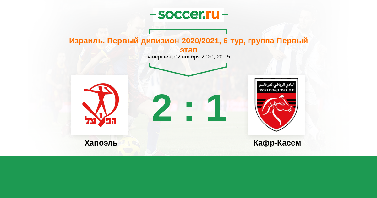 Израиль. Первый дивизион 12.02.2021 Кафр-Касем Логотип футбольный клуб Кафр-Касем 0:0 Логотип футбольный клуб Хапоэль (Иксал) Хапоэль