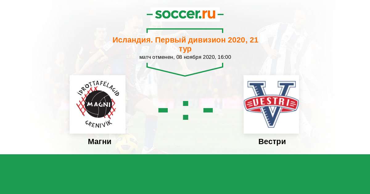 Исландия. Первый дивизион 15.09.2020 Вестри Логотип футбольный клуб Вестри (Хнифсдалюр) 2:1 Логотип футбольный клуб Магни (Гренивик) Магни