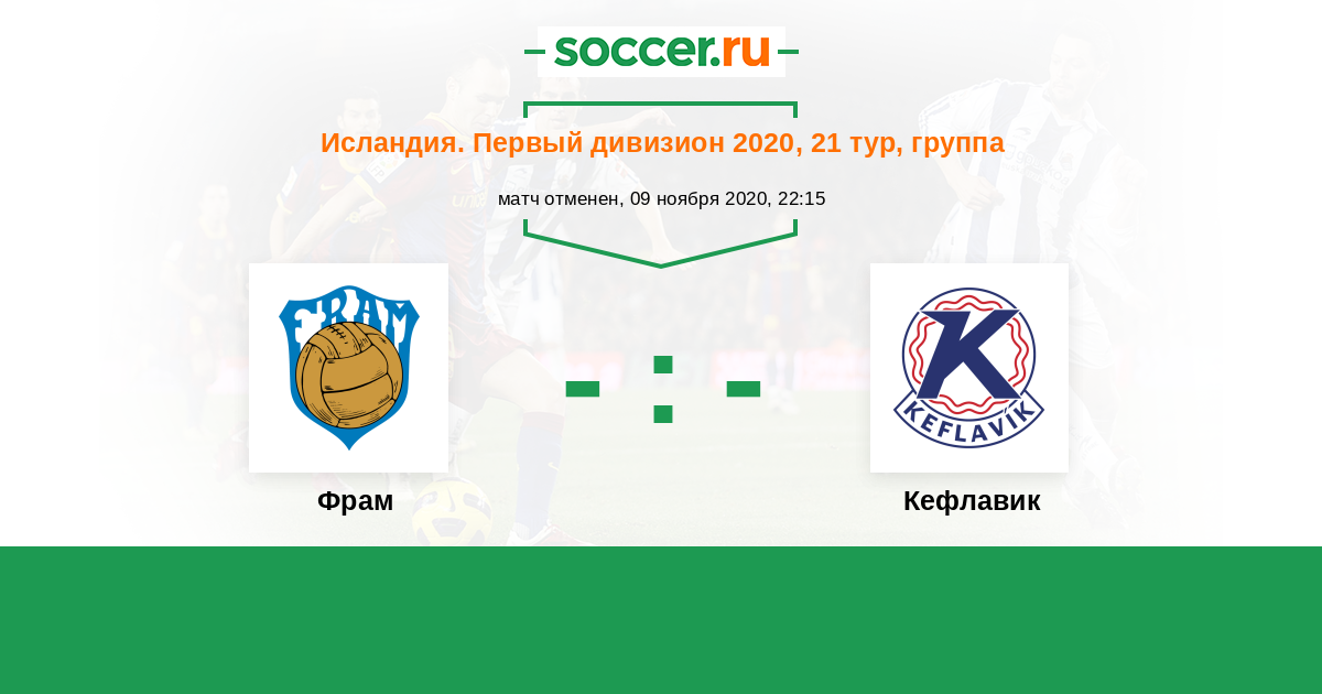 Исландия. Первый дивизион 17.09.2020 Кефлавик Логотип футбольный клуб Кефлавик (Рейкьянесбар) 1:1 Логотип футбольный клуб Фрам (Рейкьявик) Фрам